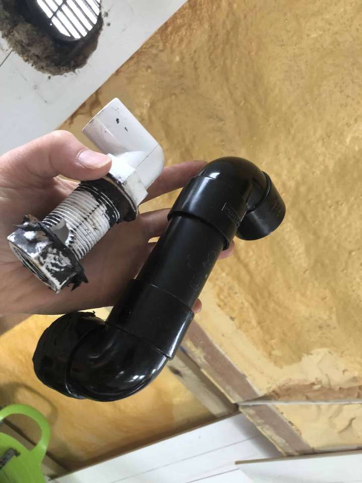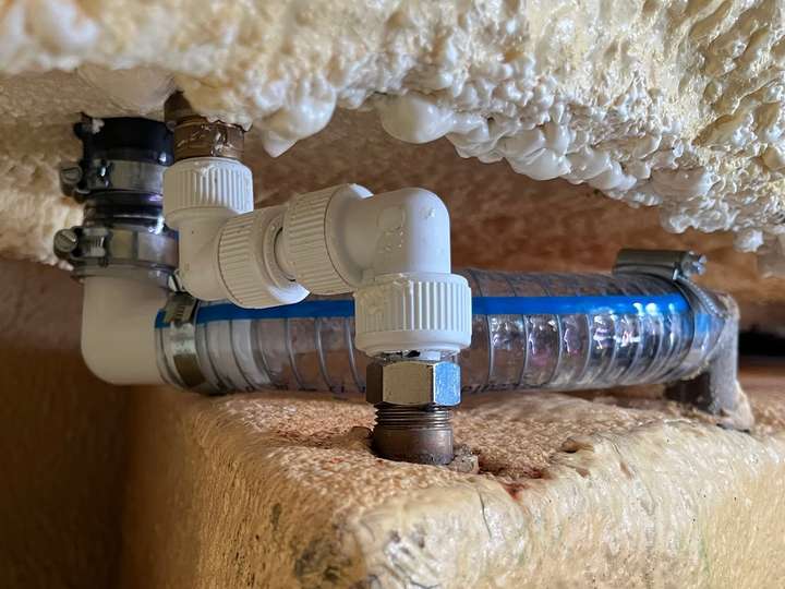 The breather pipe was also really tricky as it was now needed two elbows with a really short piece of pipe in between. There was no space for any extra pipe – the fittings were back-to-back, but luckily fitted perfectly! This pipe and the fittings were reclaimed from the strip-out; I just had to add an olive for the metal fitting, unlike the previous fitter who had just used more sealant! I finished it off with a bit of spray foam to cover and insulate the exposed metal.
