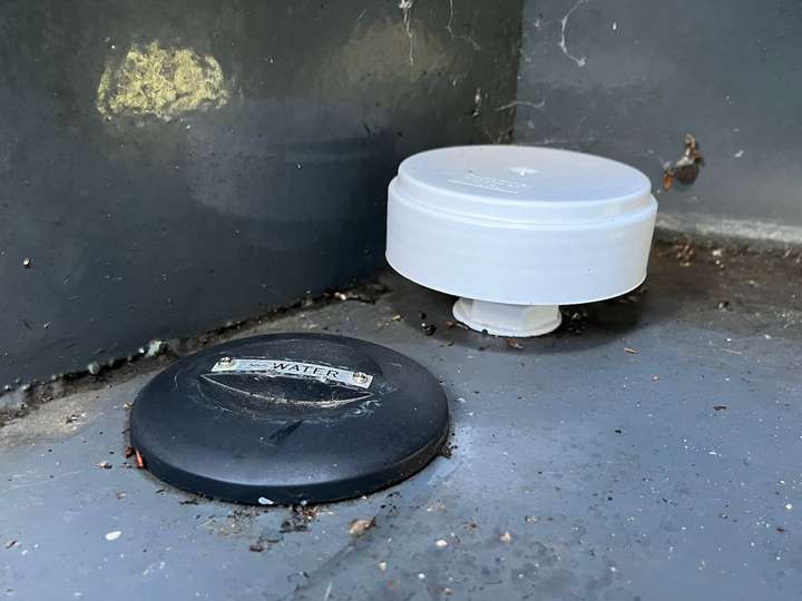 Originally the filler (black) and breather (white, covered in black sealant) looked like this. The breather was an open pipe with no fly screen, with two bits of different sized pipe held together with sealant, and the filler was a rigid plastic PVC waste pipe. There was also a lot of exposed metal around the skin fittings which needed protecting from rust.