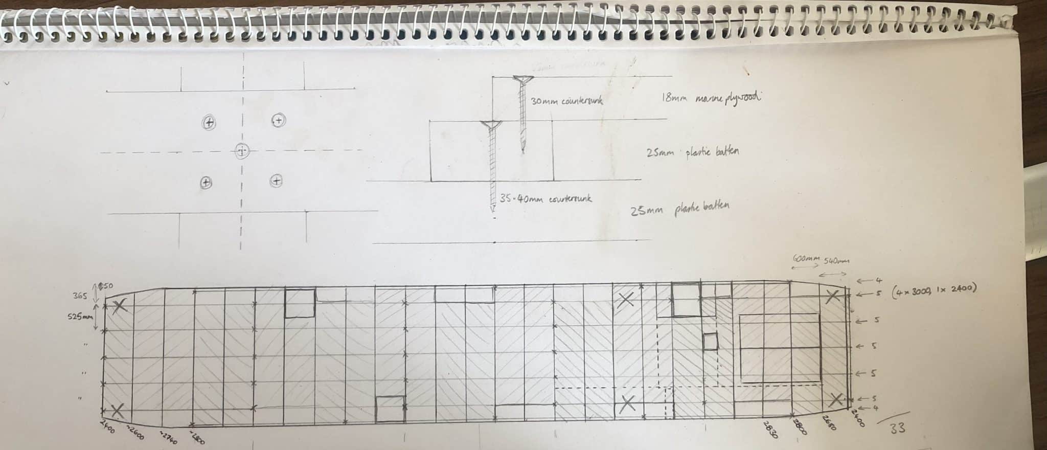 The larger blocks are 96mm high, the smaller blocks are 100mm high and the transverse bearers are 75mm, every 2ft all the way down the boat. I placed a batten on each transverse bearer, bringing the base height of the grid to 100mm. 7 equally spaced longitudinal battens were then fixed to the transverse battens, supported in between by the smaller blocks. I used stainless steel Spax screws so they won’t rust or rot. Once screwed together, the grid was held securely by the shape of the boat, with leeway for expansion/contraction.