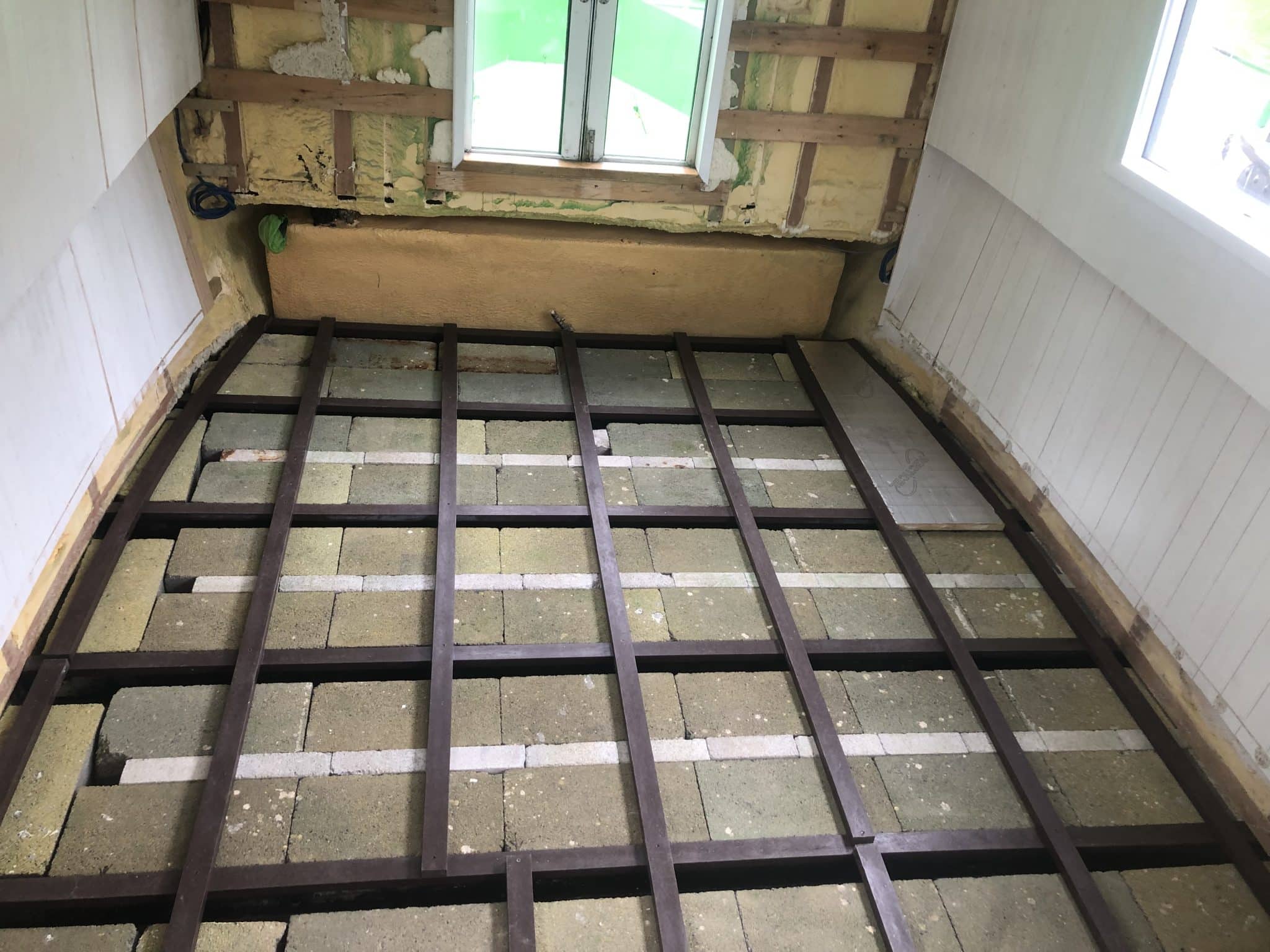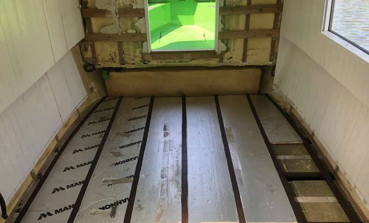 Since the floor as being constructed in sections, starting from the bow, I didn’t realise that the small ballast blocks were only added to the bow third of the boat in order to counterbalance the batteries. Past this it was only the larger blocks so I needed to add 4mm shims (cut from the plastic lumber) to support the battens half way between each transverse beam. At the stern end of the boat the ballast had been removed completely, so I created a floating floor structure with more rigid 50x50mm lengths of lumber used transversely, supported by 50x50mm pillars cut from the same stuff.