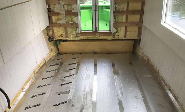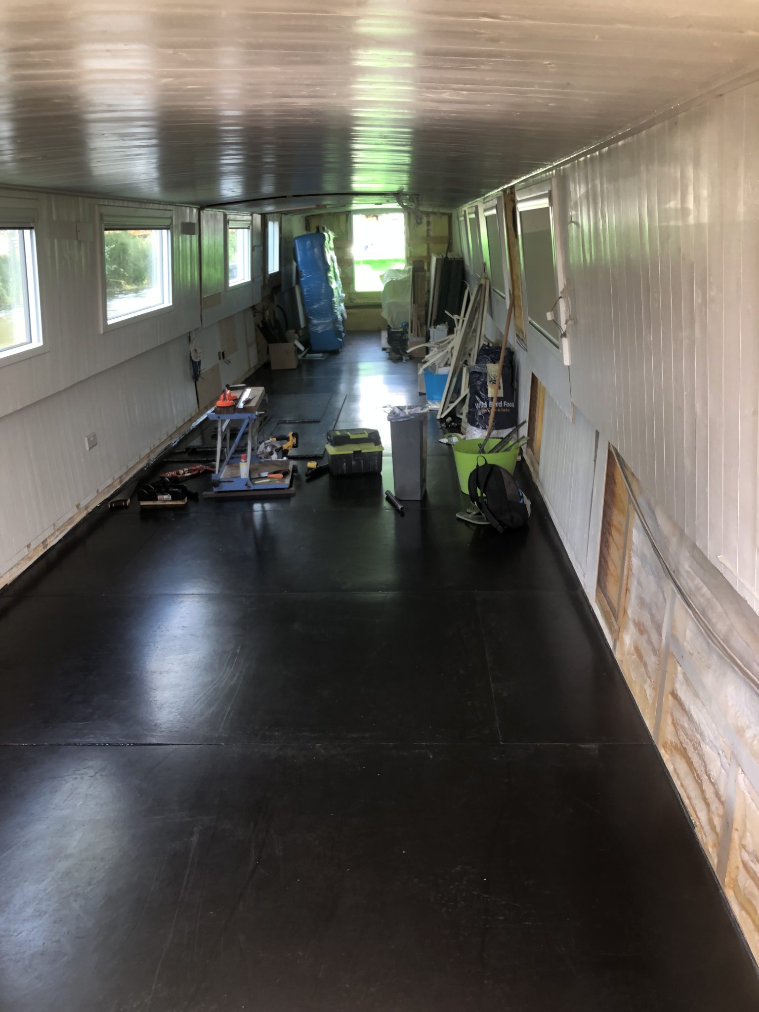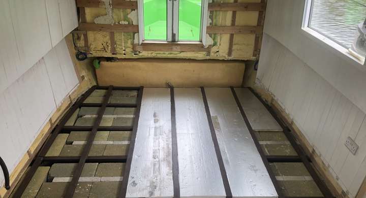 Next was to put the floor down – these were sheets of stormboard; recycled mixed plastic core with a recycled plastic coating top and bottom. One thing I didn’t realise when working with plastic was all the microplastics you create when working with it; every time you cut it you create plastic dust which you can’t recycle (the tip wouldn’t take my bag of the stuff) so it has to go straight to landfill. I was also careful to cut everything inside the boat and vacuum up all the mess so there was no chance of it getting in the river and becoming part of the ocean plastic soup.
