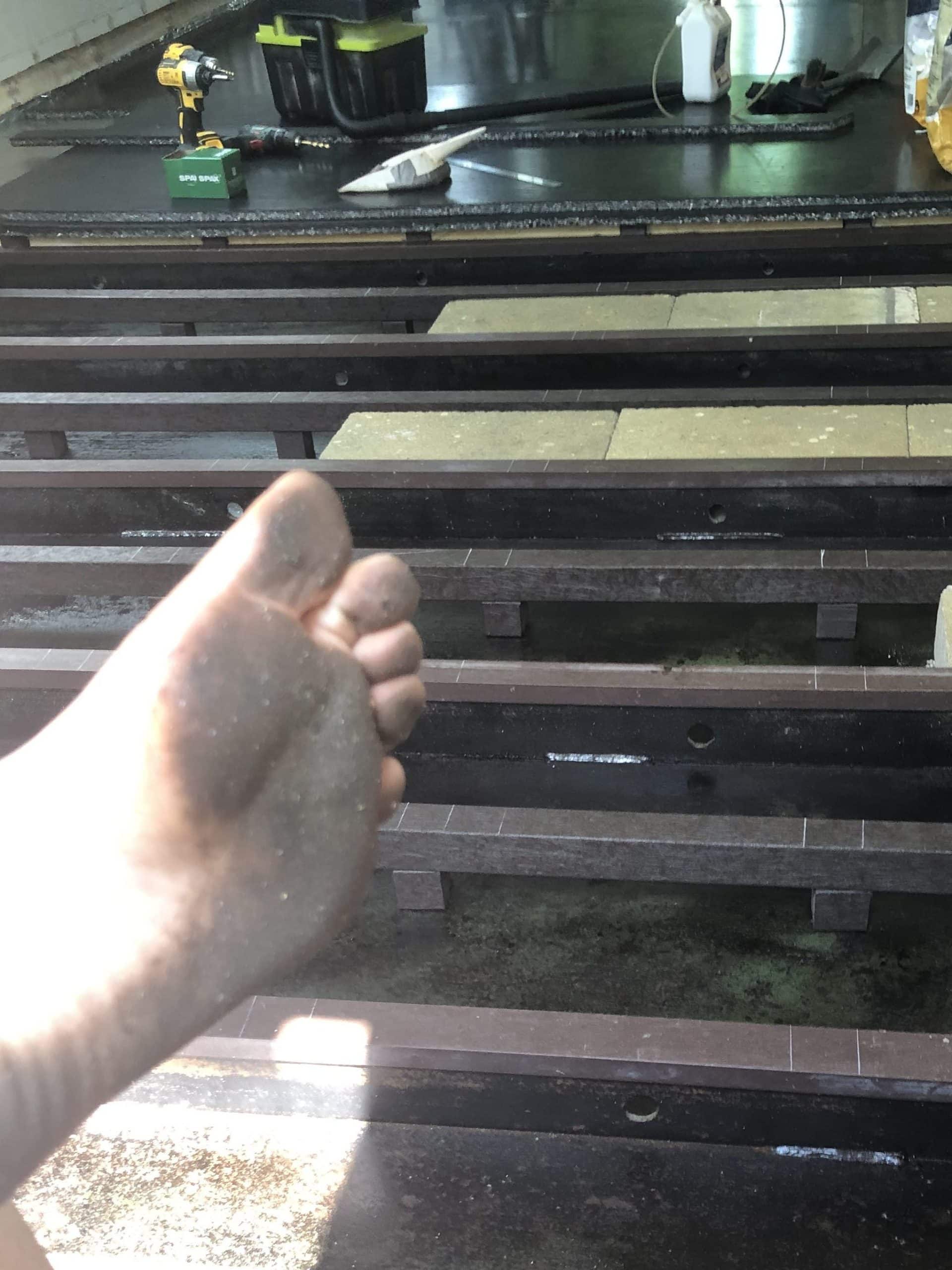 At this point the floor was a bit of a ninja warrior course as the Lanoguard beneath was still wet while the grid was under construction and not screwed down on the precarious little pillars… needless to say there were occasions when I slipped off the grid and put my foot in the grease! Thanks to the nature of the grease, the blackness came off in the wash, and my feet were super-soft afterwards!
