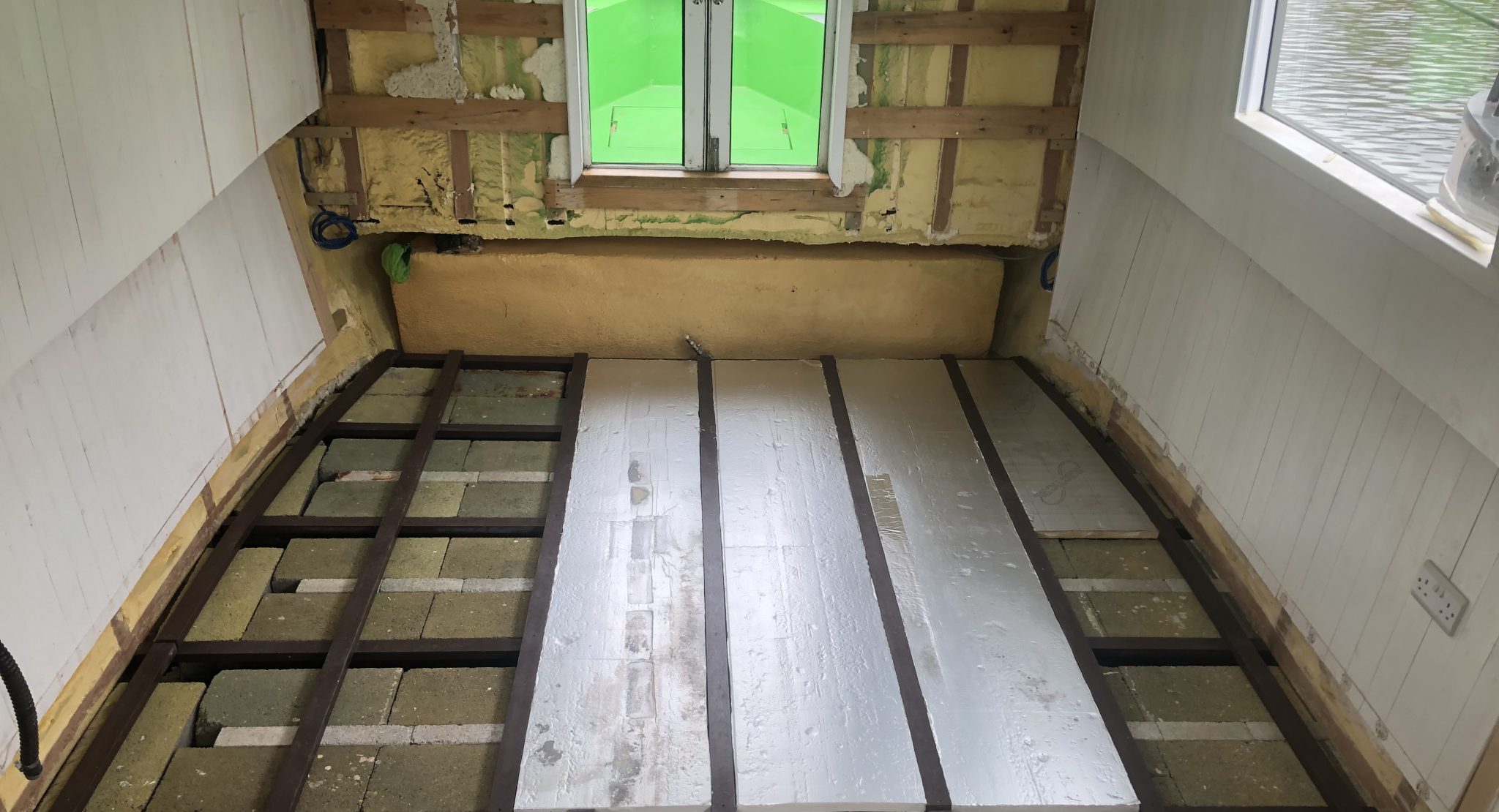Since the floor as being constructed in sections, starting from the bow, I didn’t realise that the small ballast blocks were only added to the bow third of the boat in order to counterbalance the batteries. Past this it was only the larger blocks so I needed to add 4mm shims (cut from the plastic lumber) to support the battens half way between each transverse beam. At the stern end of the boat the ballast had been removed completely, so I created a floating floor structure with more rigid 50x50mm lengths of lumber used transversely, supported by 50x50mm pillars cut from the same stuff.